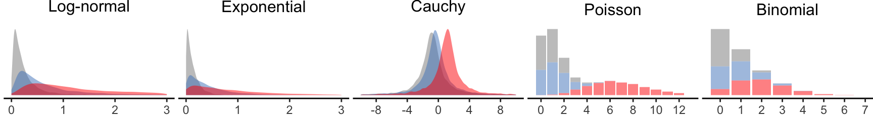 Several papers we reviewed, citing ARTool (Wobbrock et al. 2011), justify their use of ART based on the presence of “nonparametric data.” However, it is important to clarify that terms like “parametric” or “nonparametric” refer to properties of the statistical model, not inherent characteristics of the collected data. Even when ANOVA is clearly unsuitable, there are often alternative parametric methods for addressing violations of common statistical assumptions and still ensure that results can be easily communicated and interpreted. For example, one can log-transform positively skewed data following log-normal distributions or use generalized mixed-effects models, which provide support for a broader set of data distributions. Finally, employing simulations, as we did in this article, is an excellent method for evaluating the impact and risks of assumption violations and determine which data analysis procedures to use.