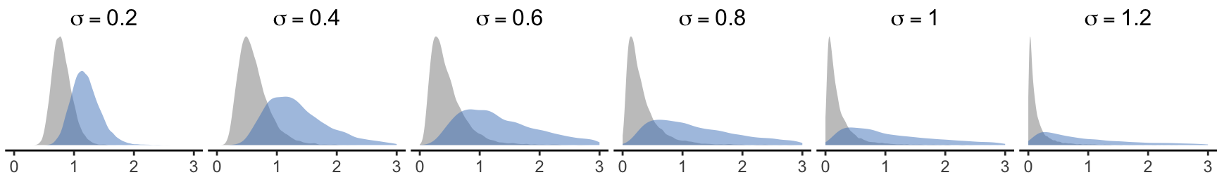 We evaluate log-normal distributions across a wider range of \(\sigma\) values (see Figure 6), with particular attention to distributions with smaller variance, which exhibit lower degrees of skewness.